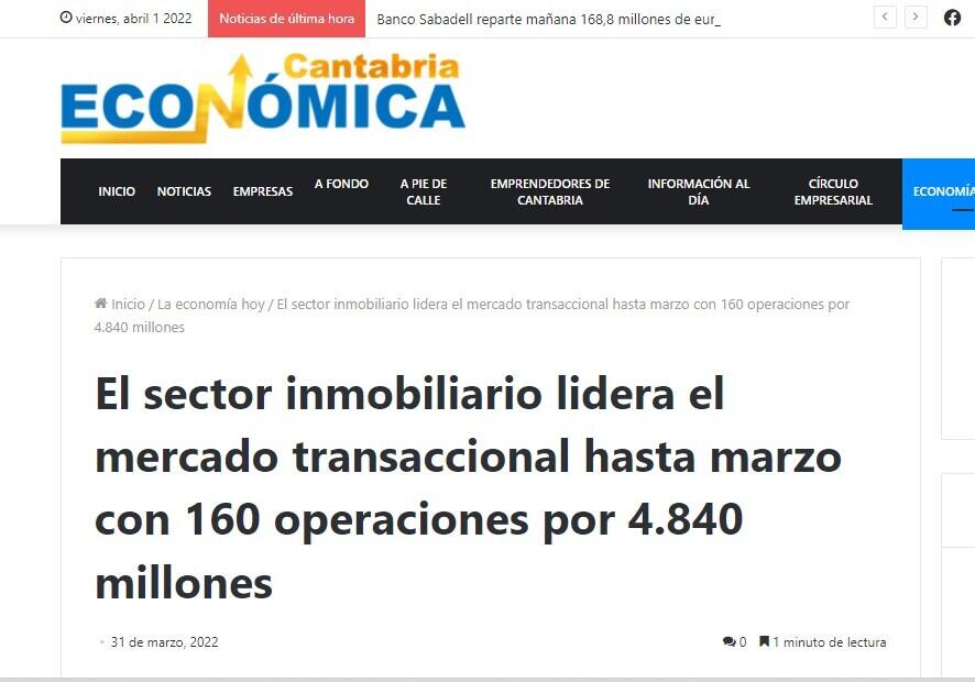 The post El sector inmobiliario lidera el mercado transaccional hasta marzo con 160 operaciones por 4.840 millones first appeared on Crónica de Cantabria.