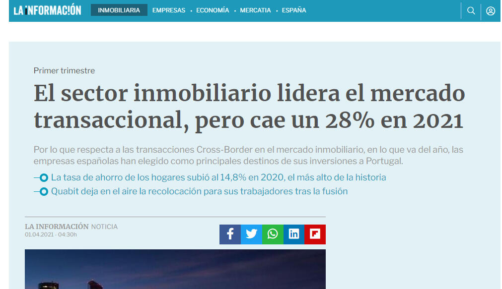 El sector inmobiliario lidera el mercado transaccional, pero cae un 28% en 2021