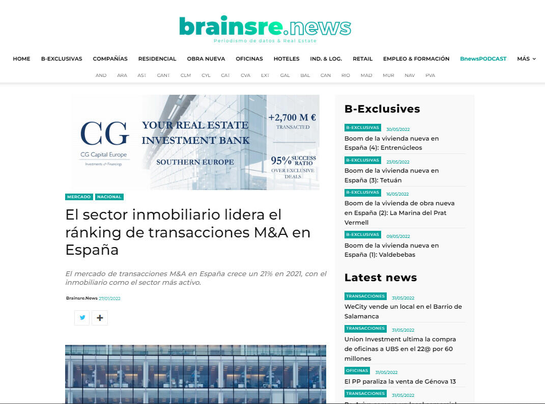 El sector inmobiliario lidera el ránking de transacciones M&A en España