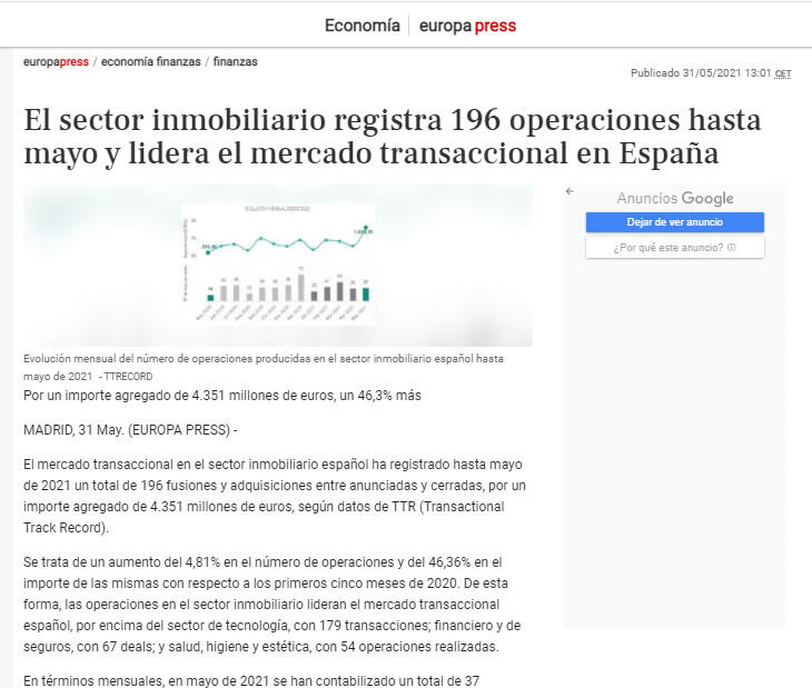 El mercado transaccional en el sector inmobiliario español ha registrado hasta mayo de 2021 un total de 196 fusiones y adquisiciones entre anunciadas y cerradas, por un importe agregado de 4.351 millones de euros, según datos de TTR (Transactional Track Record).
