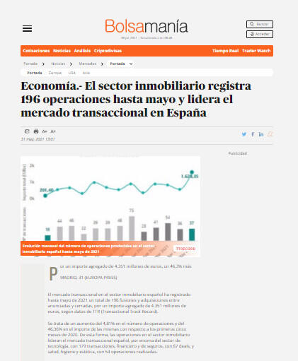 El mercado transaccional en el sector inmobiliario español ha registrado hasta mayo de 2021 un total de 196 fusiones y adquisiciones entre anunciadas y cerradas, por un importe agregado de 4.351 millones de euros, según datos de TTR (Transactional Track Record).