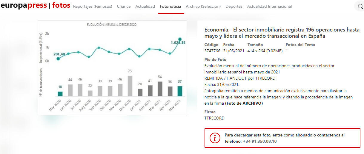 Evolución mensual del número de operaciones producidas en el sector inmobiliario español hasta mayo de 2021