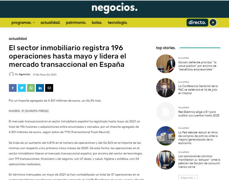 El mercado transaccional en el sector inmobiliario español ha registrado hasta mayo de 2021 un total de 196 fusiones y adquisiciones entre anunciadas y cerradas, por un importe agregado de 4.351 millones de euros, según datos de TTR (Transactional Track Record).