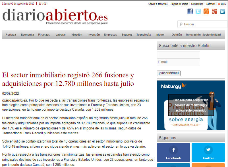Solo en julio se contabilizaron un total de 40 operaciones en el sector inmobiliario, por valor de 1.446,49 millones, si bien enero sigue siendo el mes más activo en el sector en lo que va de año.