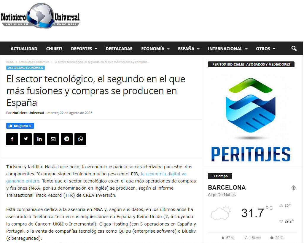 Esta compañía se dedica a la asesoría en M&A y, según sus datos, en los últimos años ha asesorado a Telefónica Tech en sus adquisiciones en España y Reino Unido (7, incluyendo la compra de Cancom UK&I o Incremental), Gigas Hosting (con 5 operaciones en España y Portugal, o la venta de compañías tecnológicas como Quipu (enterprise software) o Blueliv (ciberseguridad).