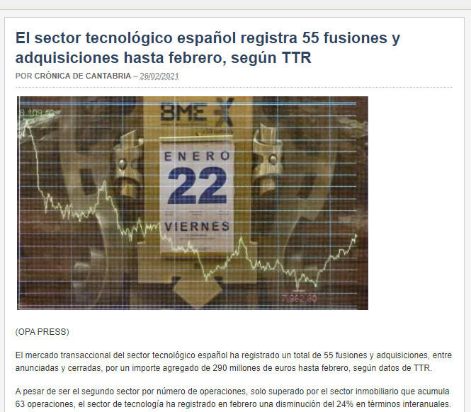 El mercado transaccional del sector tecnológico español ha registrado un total de 55 fusiones y adquisiciones, entre anunciadas y cerradas, por un importe agregado de 290 millones de euros hasta febrero, según datos de TTR.