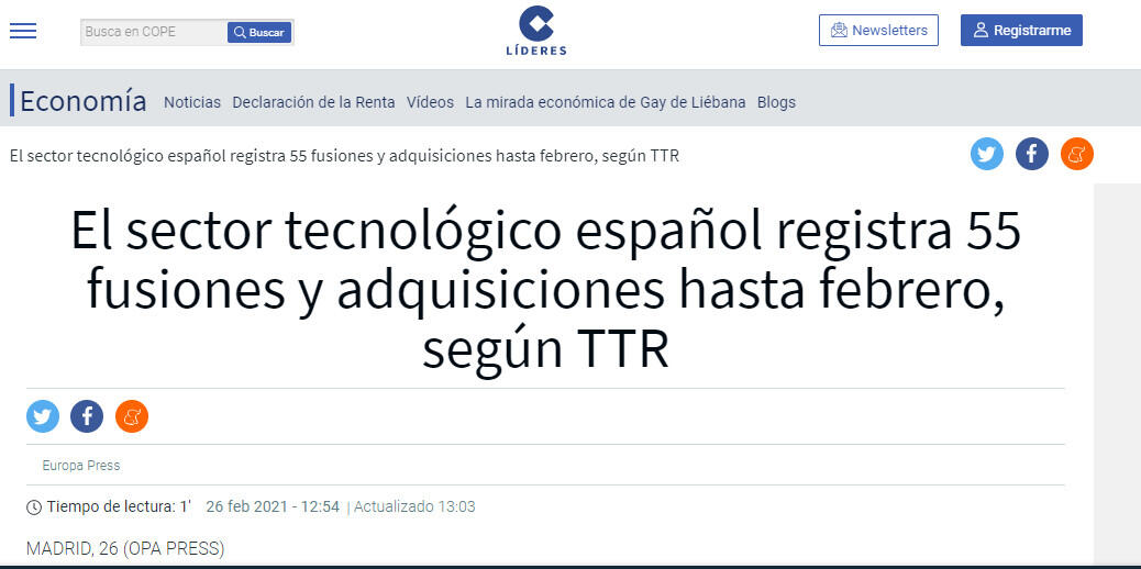 El sector tecnológico español registra 55 fusiones y adquisiciones hasta febrero, según TTR