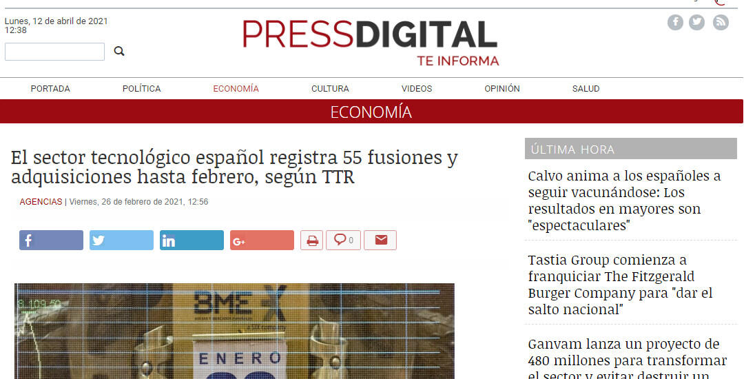El sector tecnológico español registra 55 fusiones y adquisiciones hasta febrero, según TTR