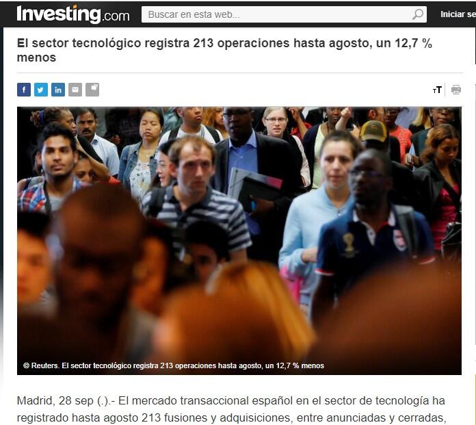 La consultora ha explicado que el sector de la tecnología ocupa el segundo lugar en el mercado transaccional español, superado por el inmobiliario, que ha contabilizado 278 operaciones.