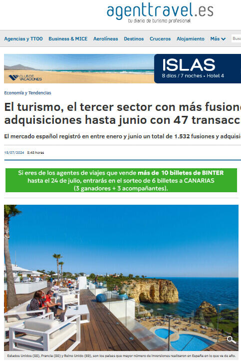 El turismo se sitúa como el tercer sector en España con más fusiones y adquisiciones en el primer semestre de 2024, con un total de 47 transacciones, lo que supone un 68% más en comparación con el mismo periodo del año anterior.