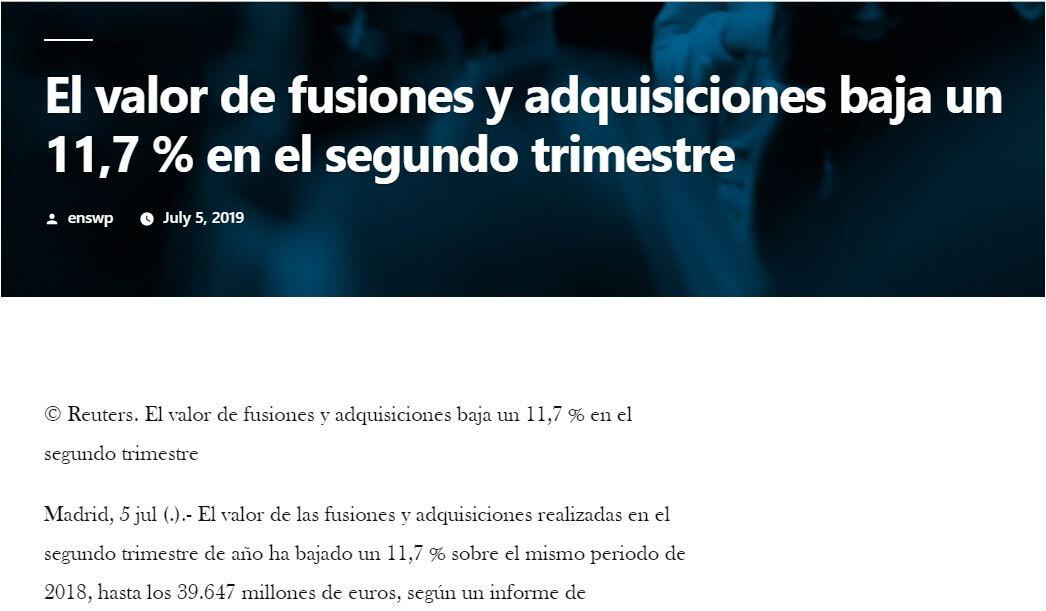 l valor de las fusiones y adquisiciones realizadas en el segundo trimestre de año ha bajado un 11,7 % sobre el mismo periodo de 2018, hasta los 39.647 millones de euros, según un informe de Transactional Track Record (TTR).