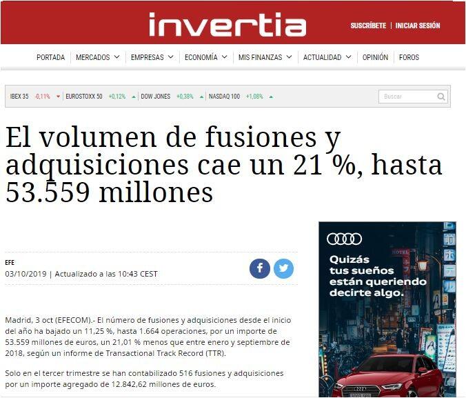 El número de fusiones y adquisiciones desde el inicio del año ha bajado un 11,25 %, hasta 1.664 operaciones, por un importe de 53.559 millones de euros, un 21,01 % menos que entre enero y septiembre de 2018, según un informe de Transactional Track Record (TTR).