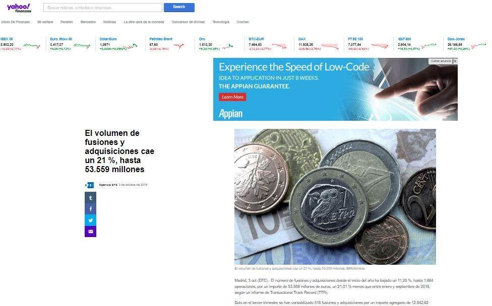 El número de fusiones y adquisiciones desde el inicio del año ha bajado un 11,25 %, hasta 1.664 operaciones, por un importe de 53.559 millones de euros, un 21,01 % menos que entre enero y septiembre de 2018, según un informe de Transactional Track Record (TTR).