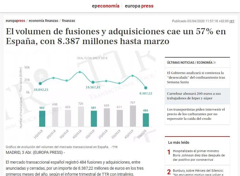 El mercado transaccional español registró 484 fusiones y adquisiciones, entre anunciadas y cerradas, por un importe de 8.387,22 millones de euros en los tres primeros meses del año, según el informe trimestral de TTR con Intralinks.