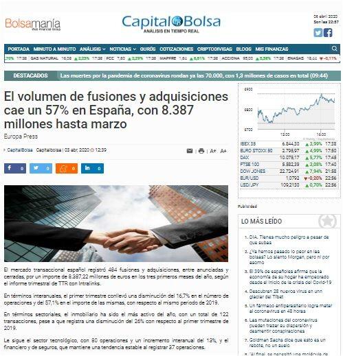 El mercado transaccional español registró 484 fusiones y adquisiciones, entre anunciadas y cerradas, por un importe de 8.387,22 millones de euros en los tres primeros meses del año, según el informe trimestral de TTR con Intralinks.