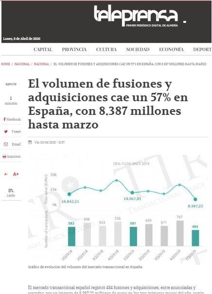 En términos interanuales, el primer trimestre conllevó una disminución del 16,7% en el número de operaciones y del 57,1% en el importe de las mismas, con respecto al mismo periodo de 2019.