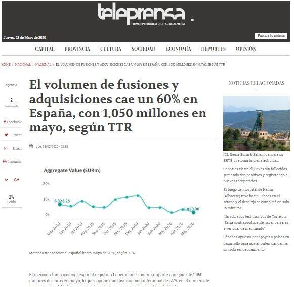 El volumen de fusiones y adquisiciones cae un 60% en España, con 1.050 millones en mayo, según TTR