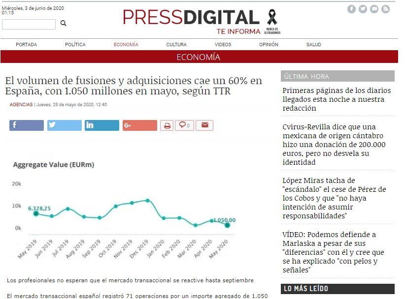El volumen de fusiones y adquisiciones cae un 60% en España, con 1.050 millones en mayo, según TTR