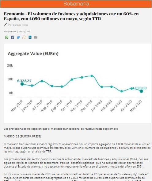 El volumen de fusiones y adquisiciones cae un 60% en España, con 1.050 millones en mayo, según TTR