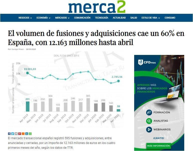 En abril, un mes marcado por el estado de alarma por la crisis del coronavirus, se llevaron a cabo 59 operaciones de fusión o adquisición, con un importe agregado de 2.785,6 millones de euros.