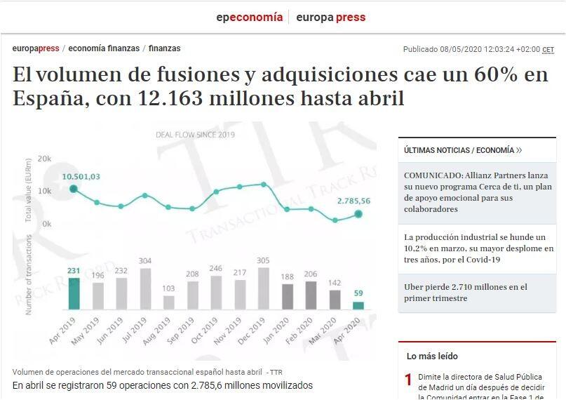 En abril, un mes marcado por el estado de alarma por la crisis del coronavirus, se llevaron a cabo 59 operaciones de fusión o adquisición, con un importe agregado de 2.785,6 millones de euros.
