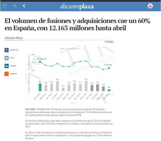 En abril, un mes marcado por el estado de alarma por la crisis del coronavirus, se llevaron a cabo 59 operaciones de fusión o adquisición, con un importe agregado de 2.785,6 millones de euros.