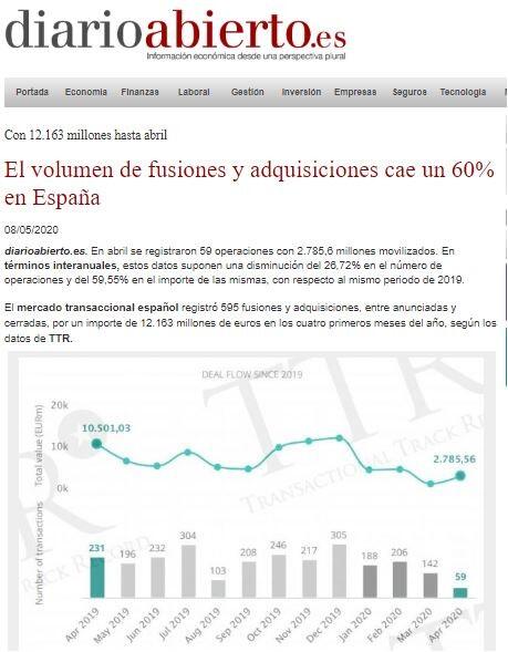 En abril se registraron 59 operaciones con 2.785,6 millones movilizados. En términos interanuales, estos datos suponen una disminución del 26,72% en el número de operaciones y del 59,55% en el importe de las mismas, con respecto al mismo periodo de 2019.