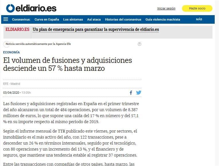 Las fusiones y adquisiciones registradas en España en el primer trimestre del año alcanzaron un total de 484 operaciones, por un volumen de 8.387 millones de euros, lo que supone una caída del 17 % en número y del 57,1 % en su importe respecto al mismo periodo de 2019.