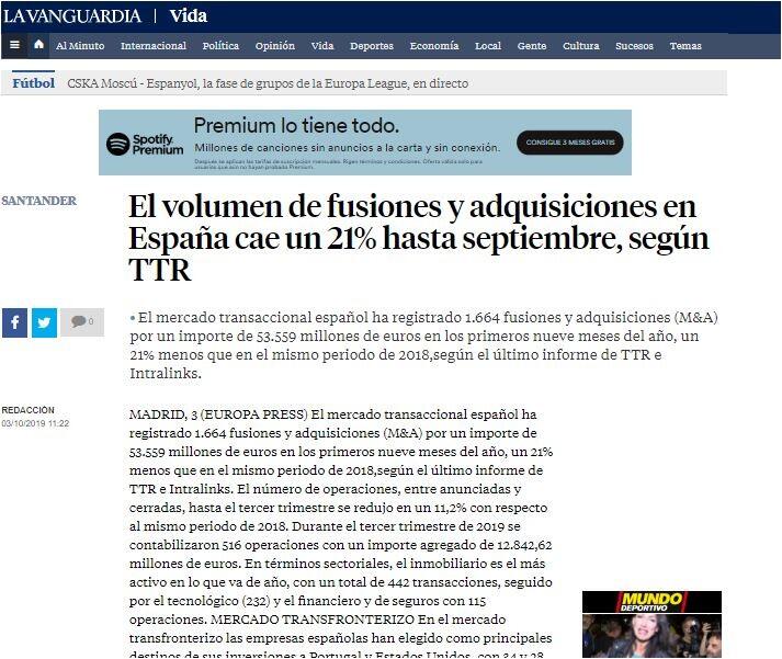 El mercado transaccional español ha registrado 1.664 fusiones y adquisiciones (M&A) por un importe de 53.559 millones de euros en los primeros nueve meses del año, un 21% menos que en el mismo periodo de 2018,según el último informe de TTR e Intralinks.