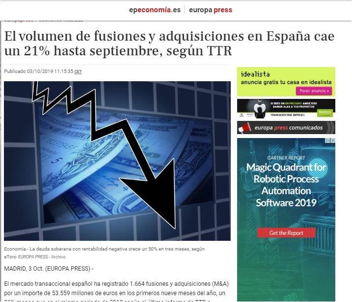 El volumen de fusiones y adquisiciones en España cae un 21% hasta septiembre, según TTR