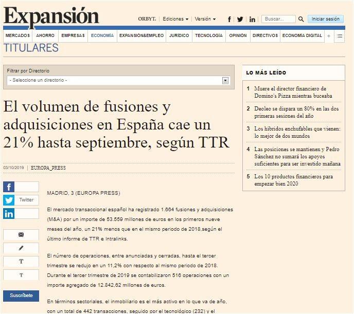 El mercado transaccional español ha registrado 1.664 fusiones y adquisiciones (M&A) por un importe de 53.559 millones de euros en los primeros nueve meses del año, un 21% menos que en el mismo periodo de 2018,según el último informe de TTR e Intralinks.
