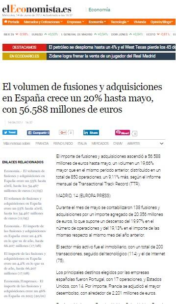 - El importe de fusiones y adquisiciones ascendió a 56.588 millones de euros hasta mayo, un volumen un 19,66% mayor que en el mismo periodo anterior, distribuido en un total de 850 operaciones, un 9,11% más, según el informe mensual de Transactional Track Record (TTR).