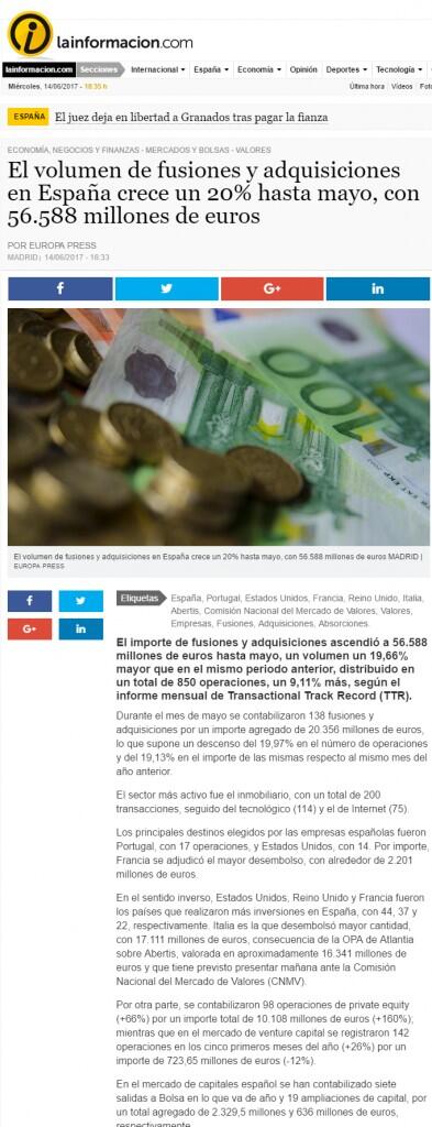 - El importe de fusiones y adquisiciones ascendió a 56.588 millones de euros hasta mayo, un volumen un 19,66% mayor que en el mismo periodo anterior, distribuido en un total de 850 operaciones, un 9,11% más, según el informe mensual de Transactional Track Record (TTR).