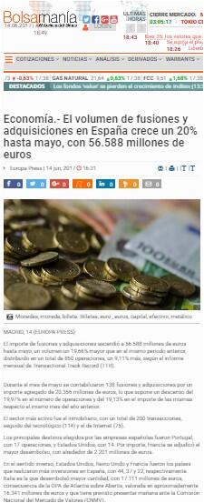 El volumen de fusiones y adquisiciones en Espaņa crece un 20% hasta mayo, con 56.588 millones de euros