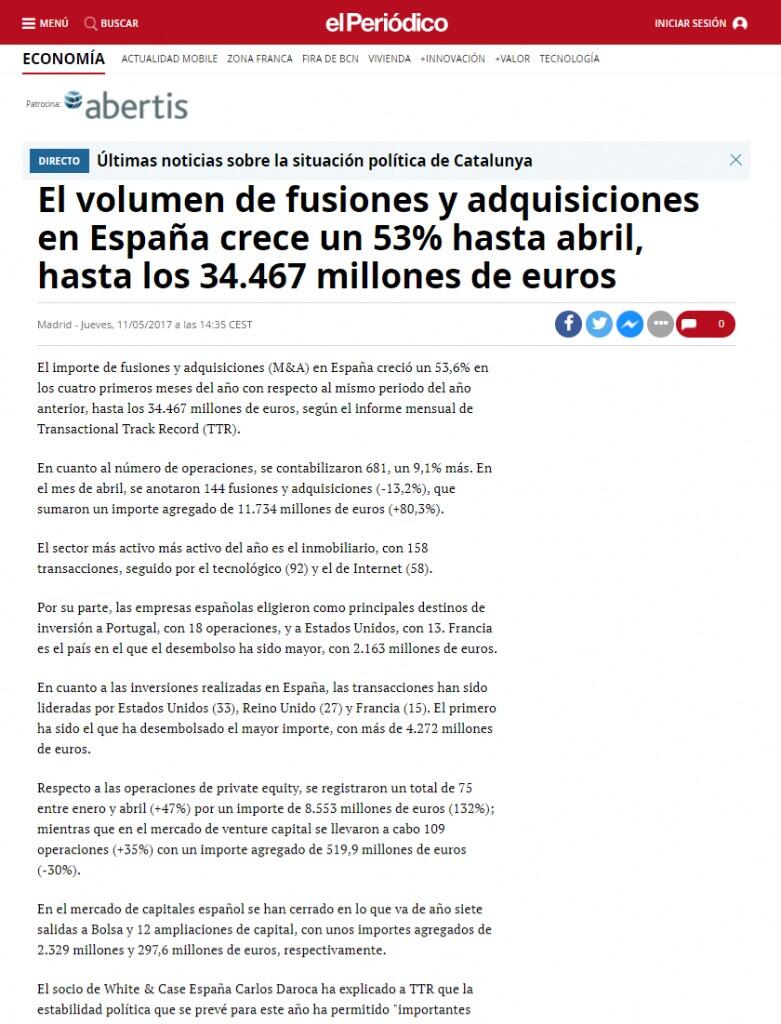 El importe de fusiones y adquisiciones (M&A) en España creció un 53,6% en los cuatro primeros meses del año con respecto al mismo periodo del año anterior, hasta los 34.467 millones de euros, según el informe mensual de Transactional Track Record (TTR).