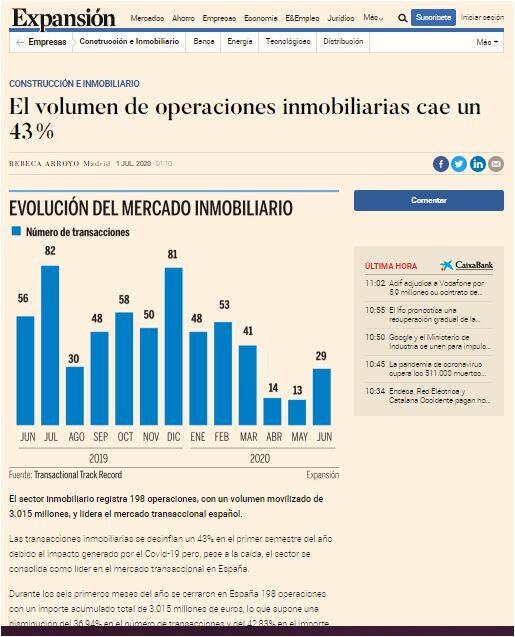 Las transacciones inmobiliarias se desinflan un 43% en el primer semestre del año debido al impacto generado por el Covid-19 pero, pese a la caída, el sector se consolida como líder en el mercado transaccional en España.