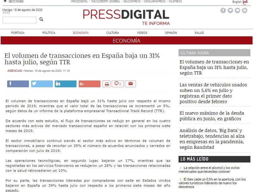 El volumen de transacciones en España bajó un 31% hasta julio con respecto al mismo periodo de 2019, mientras que el valor total de las transacciones se incrementó un 5%, según datos de un informe de la plataforma empresarial Transactional Track Record (TTR).