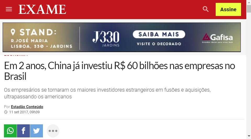 Em 2 anos, China já investiu R$ 60 bilhões nas empresas no Brasil