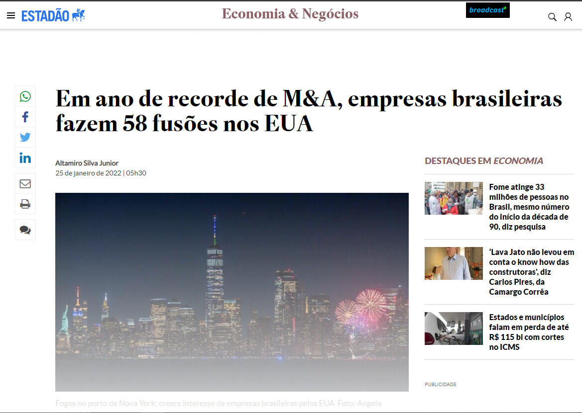As empresas brasileiras escolheram os Estados Unidos como seu principal destino para fusões e aquisições (M&A, na sigla em inglês).