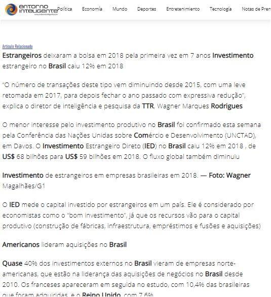O menor interesse pelo investimento produtivo no Brasil foi confirmado esta semana pela Conferência das Nações Unidas sobre Comércio e Desenvolvimento (UNCTAD), em Davos. O Investimento Estrangeiro Direto (IED) no Brasil caiu 12% em 2018 , de US$ 68 bilhões para US$ 59 bilhões em 2018. O fluxo global também diminuiu