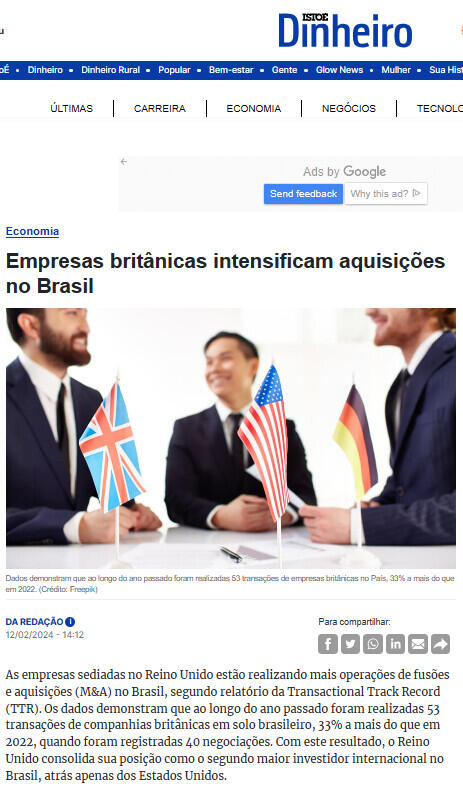 As empresas sediadas no Reino Unido estão realizando mais operações de fusões e aquisições (M&A) no Brasil, segundo relatório da Transactional Track Record (TTR). Os dados demonstram que ao longo do ano passado foram realizadas 53 transações de companhias britânicas em solo brasileiro, 33% a mais do que em 2022, quando foram registradas 40 negociações. Com este resultado, o Reino Unido consolida sua posição como o segundo maior investidor internacional no Brasil, atrás apenas dos Estados Unidos.