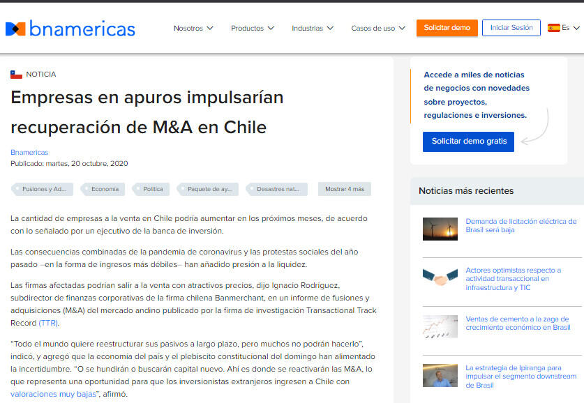 Las firmas afectadas podrían salir a la venta con atractivos precios, dijo Ignacio Rodríguez, subdirector de finanzas corporativas de la firma chilena Banmerchant, en un informe de fusiones y adquisiciones (M&A) del mercado andino publicado por la firma de investigación Transactional Track Record (TTR).