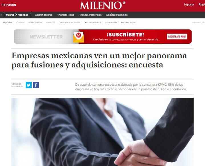 Según el reporte mensual de Transactional Track Record (TTR), durante la primera mitad el mercado M&A en México registró un repunte de 19 por ciento, en comparación con el mismo periodo del año anterior. KPMG señala que 48 por ciento de las compañías dijo encontrarse en disposición para comprar, mientras 34 por ciento indicó que está considerando una fusión.