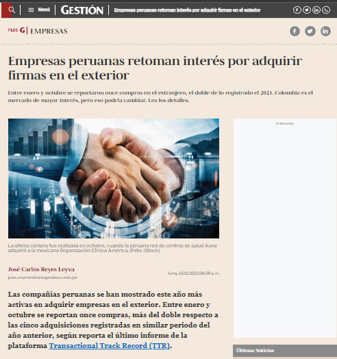 Las compañías peruanas se han mostrado este año más activas en adquirir empresas en el exterior. Entre enero y octubre se reportan once compras, más del doble respecto a las cinco adquisiciones registradas en similar periodo del año anterior, según reporta el último informe de la plataforma Transactional Track Record (TTR).