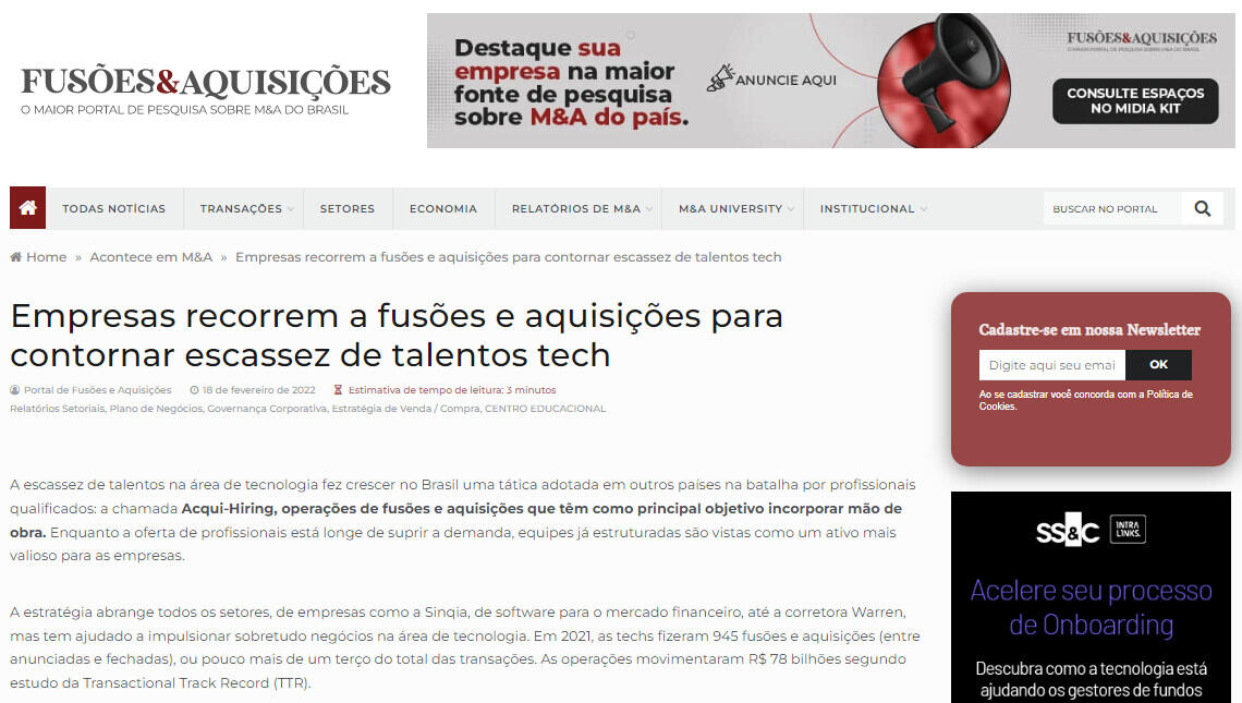 A escassez de talentos na área de tecnologia fez crescer no Brasil uma tática adotada em outros países na batalha por profissionais qualificados: a chamada Acqui-Hiring, operações de fusões e aquisições que têm como principal objetivo incorporar mão de obra. Enquanto a oferta de profissionais está longe de suprir a demanda, equipes já estruturadas são vistas como um ativo mais valioso para as empresas.