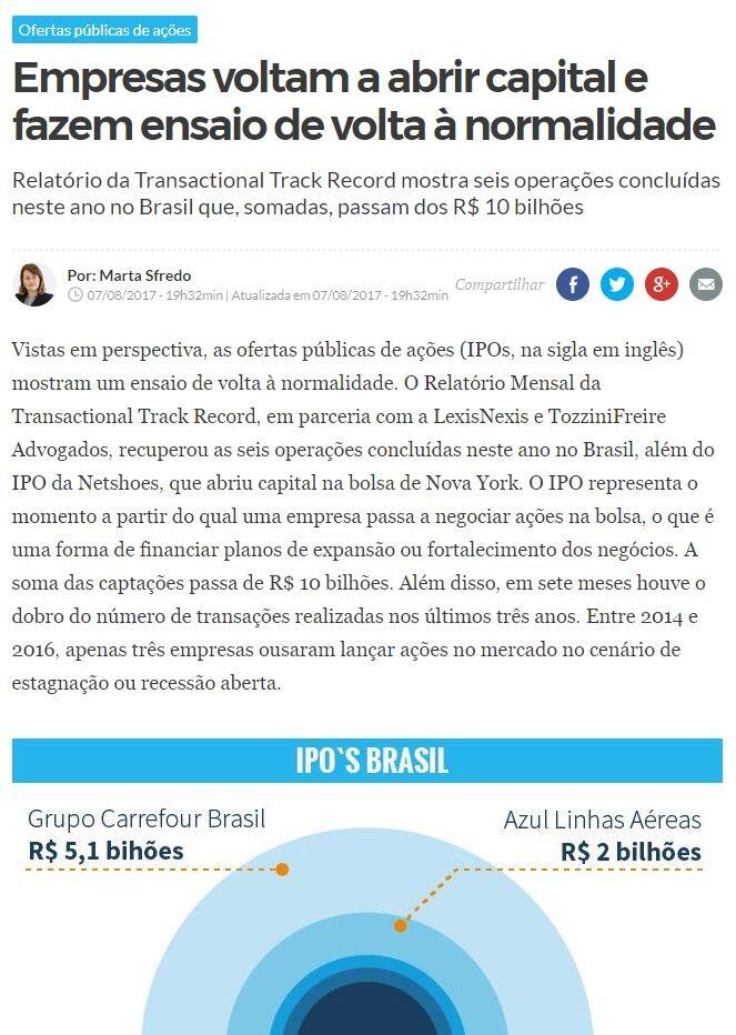 Vistas em perspectiva, as ofertas públicas de ações (IPOs, na sigla em inglês) mostram um ensaio de volta à normalidade. O Relatório Mensal da Transactional Track Record, em parceria com a LexisNexis e TozziniFreire Advogados, recuperou as seis operações concluídas neste ano no Brasil, além do IPO da Netshoes, que abriu capital na bolsa de Nova York. O IPO representa o momento a partir do qual uma empresa passa a negociar ações na bolsa, o que é uma forma de financiar planos de expansão ou fortalecimento dos negócios. A soma das captações passa de R$ 10 bilhões. Além disso, em sete meses houve o dobro do número de transações realizadas nos últimos três anos. Entre 2014 e 2016, apenas três empresas ousaram lançar ações no mercado no cenário de estagnação ou recessão aberta.