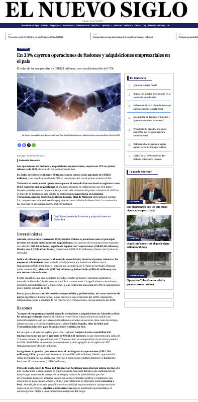 Teniendo en cuenta estas operaciones que en el mercado internacional se registran como M&A (mergers and adquisitions), el análisis elaborado en colaboración con TTR Data y Datasite, señalan que en Colombia, la operación más relevante del primer trimestre de 2025 fue el acuerdo de Telefónica para vender su participación mayoritaria en Colombia Telecomunicaciones (Coltel) a Millicom España, filial de Millicom International Cellular S.A., empresa con sede en Luxemburgo y que cotiza en la Bolsa de Nueva York. La transacción fue valorada en aproximadamente US$400 millones.