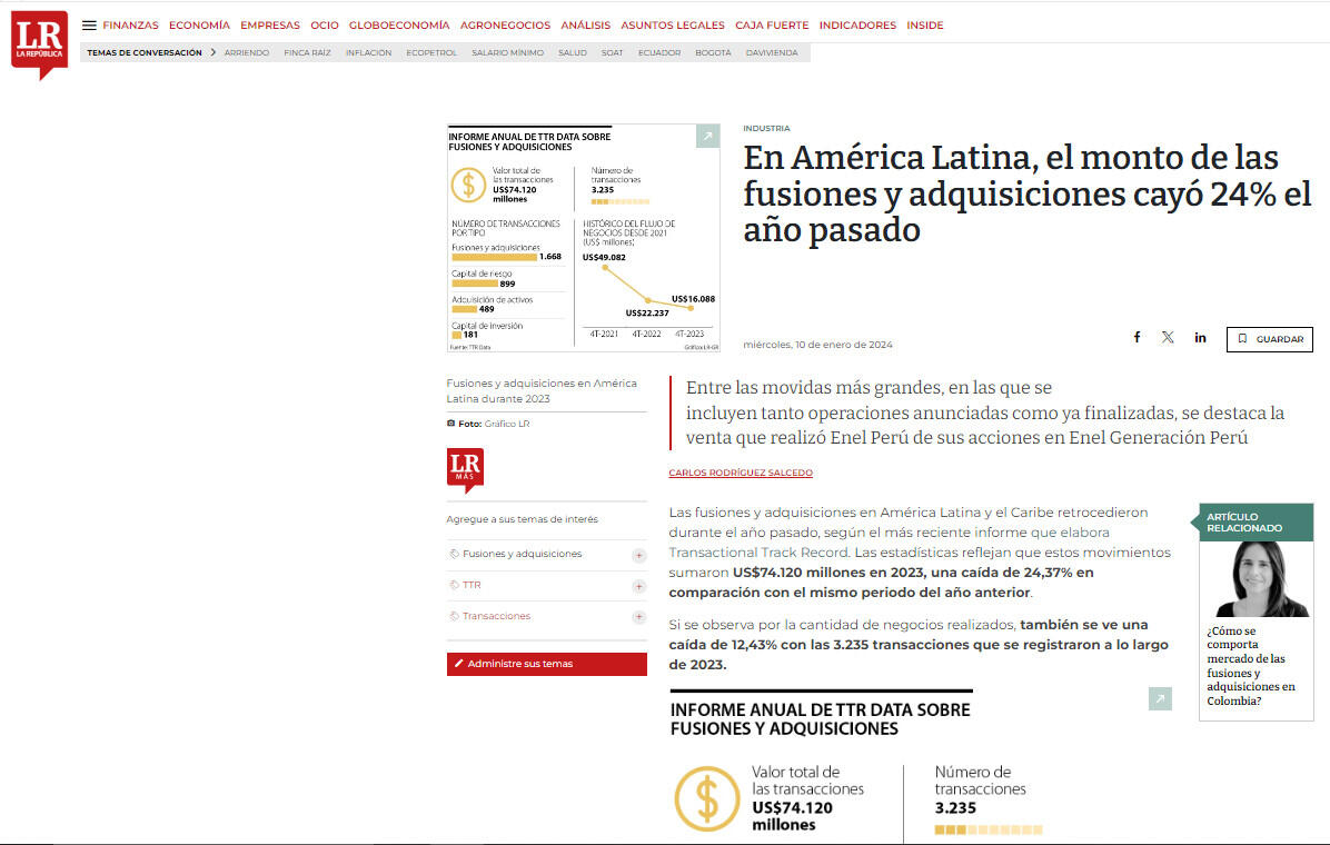 El ranking también involucra a Colombia, pues se registró el anuncio de la compra del Grupo Éxito por parte del Grupo Calleja de El Salvador. La transacción todavía se está realizando, pero el informe la avalúa en US$1.175 millones, lo que haría que el retail cambie de sus actuales dueños: el Grupo Casino.