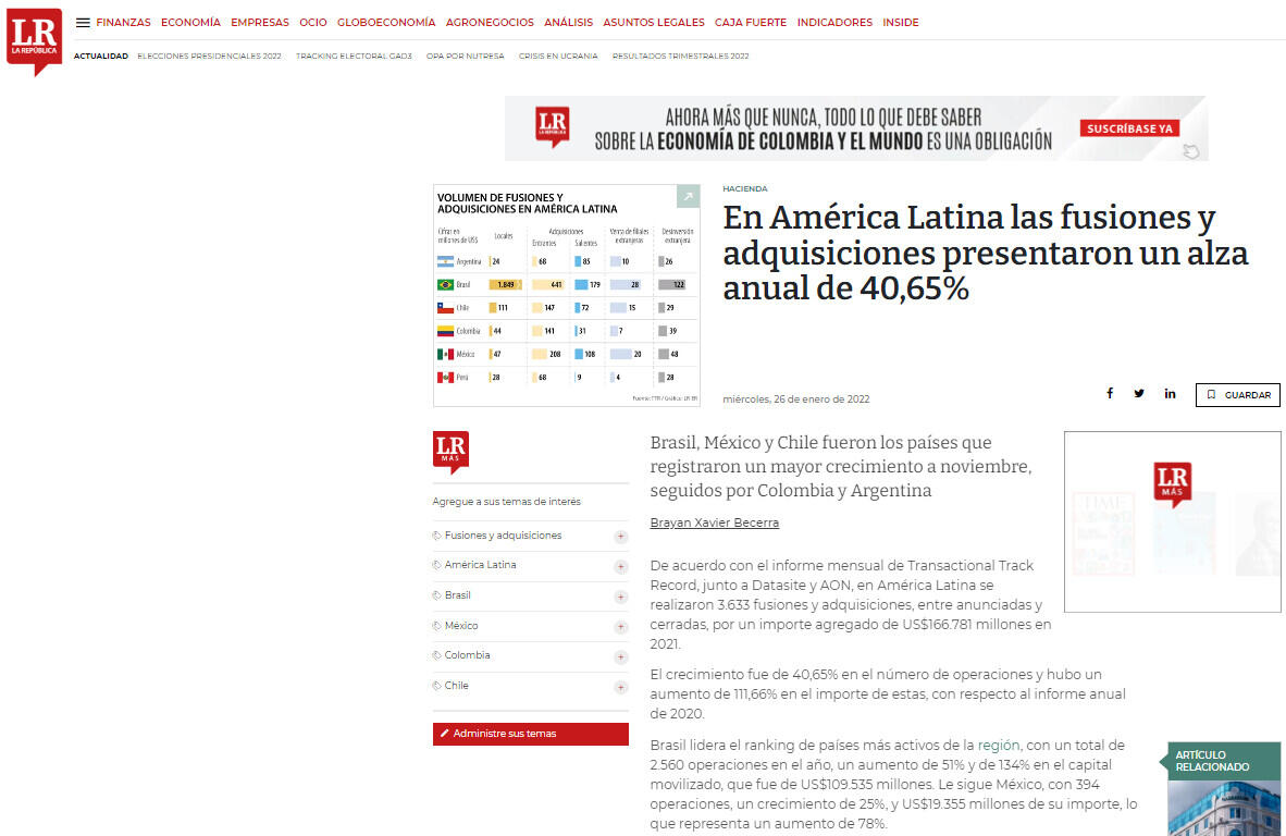 De acuerdo con el informe mensual de Transactional Track Record, junto a Datasite y AON, en América Latina se realizaron 3.633 fusiones y adquisiciones, entre anunciadas y cerradas, por un importe agregado de US$166.781 millones en 2021.
