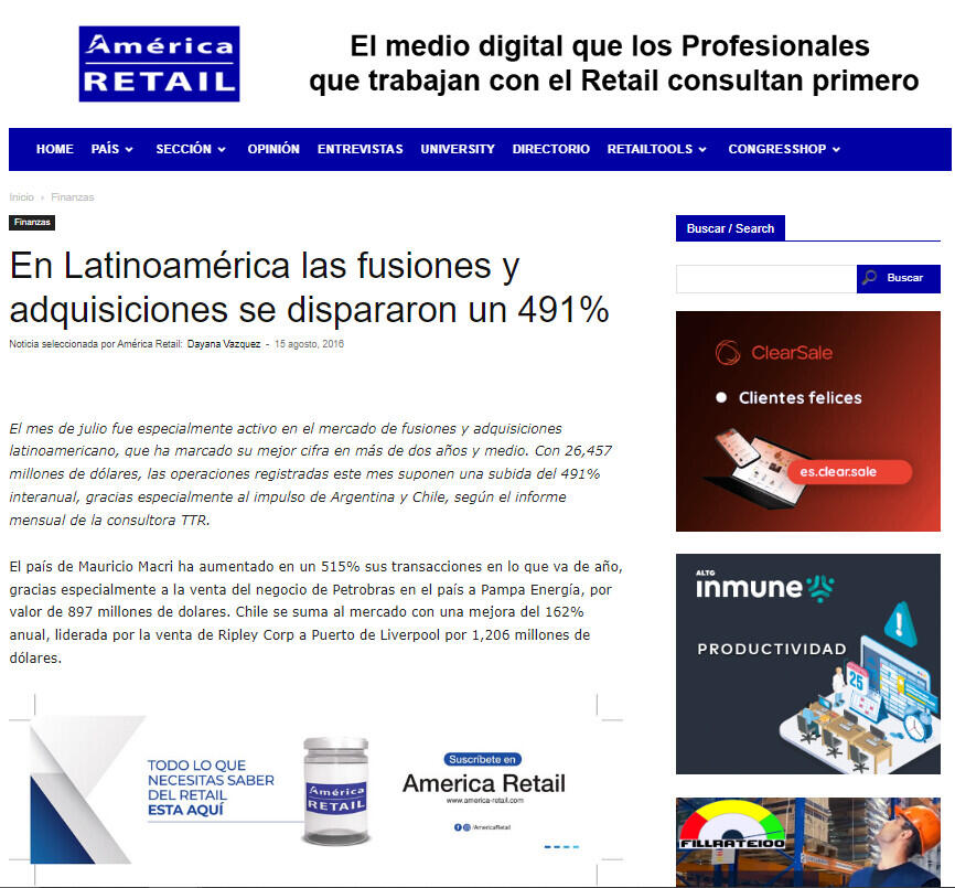El país de Mauricio Macri ha aumentado en un 515% sus transacciones en lo que va de año, gracias especialmente a la venta del negocio de Petrobras en el país a Pampa Energía, por valor de 897 millones de dolares. Chile se suma al mercado con una mejora del 162% anual, liderada por la venta de Ripley Corp a Puerto de Liverpool por 1,206 millones de dólares.